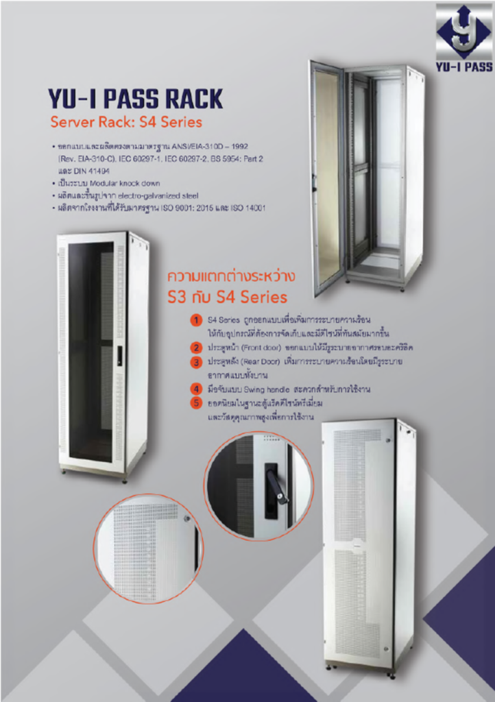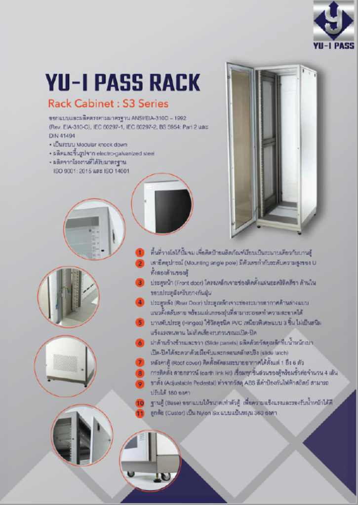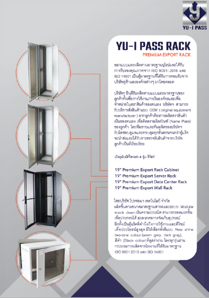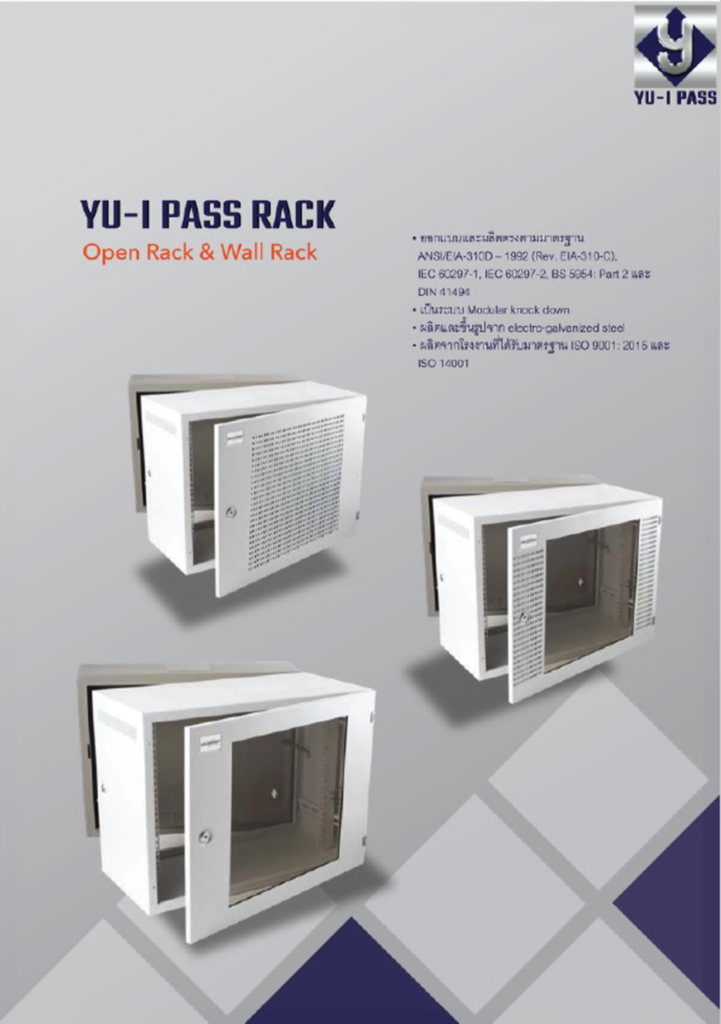 YU-I PASS Rack สุดยอดตู้แร็คสำหรับจัดเก็บอุปกรณ์ติดตั้งรองรับการใช้งานแบบภายในอาคาร และแบบกลางแจ้งภายนอกอาคาร ผลิตตามขนาดมาตรฐานสากลและระบบ Modular Knock Down สะดวกต่อการจัดเก็บอุปกรณ์ ซึ่งสินค้าออกแบบและผลิตตามมาตรฐานยุโรปและได้รับการรับรองคุณภาพจาก ISO : 9001 : 2015 และ ISO 14001 เป็นตู้มาตรฐานที่ได้รับการตอบรับจากบริษัทคู่ค้าและองค์กรต่างๆ มาโดยตลอด
